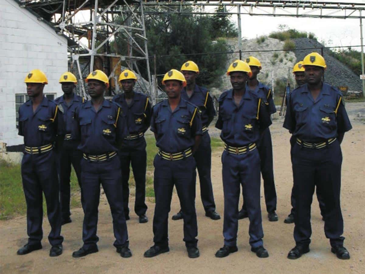 Mine security personnel stand in formation. Rights group CNRG has condemned the shooting of an artisanal miner, saying it reflects a wider pattern of violence and extortion in Zimbabwe’s mining sector. (Image: Fawcett Zimbabwe)
