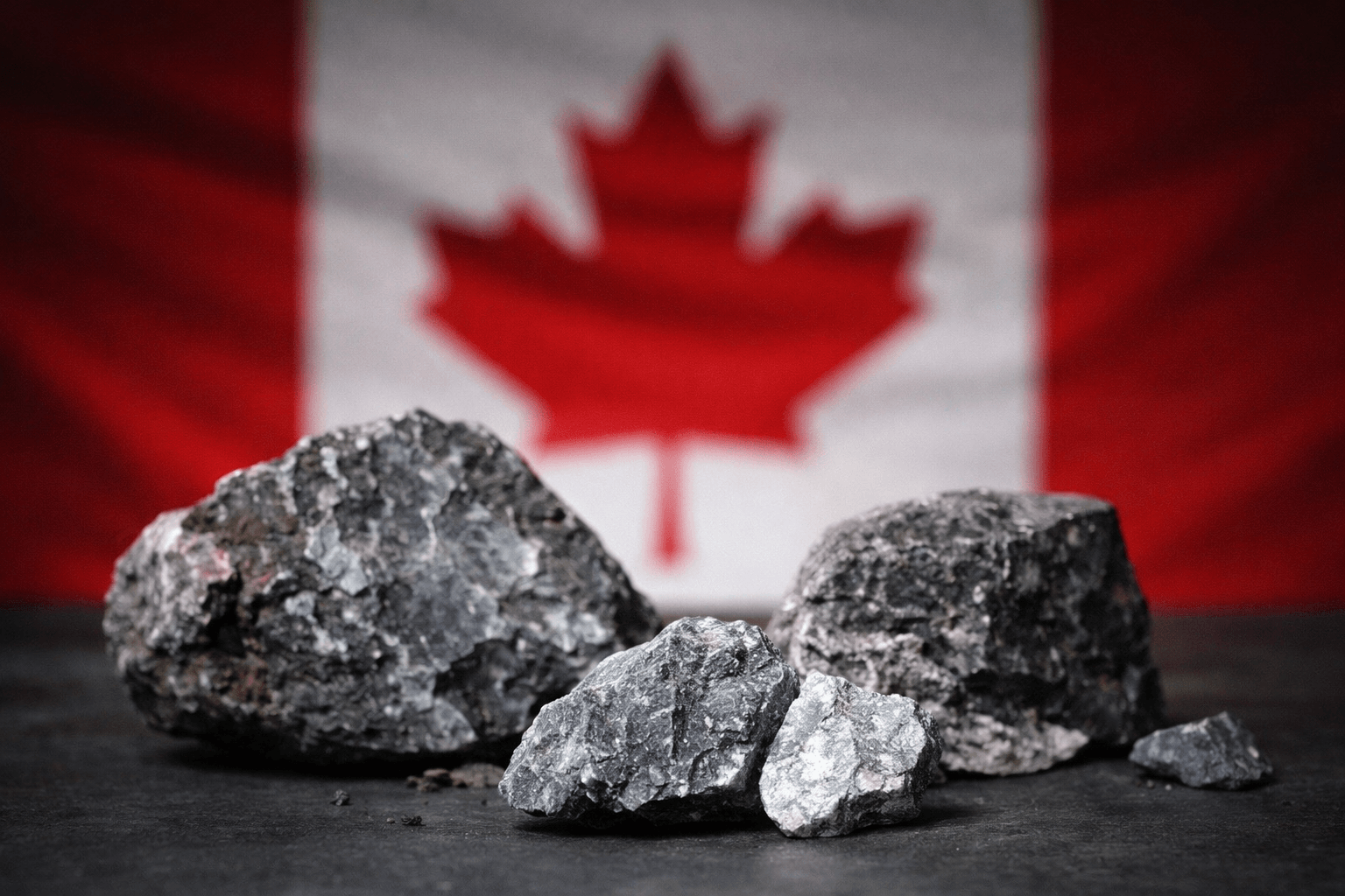 Rare earth mineral ore samples in front of a Canadian flag